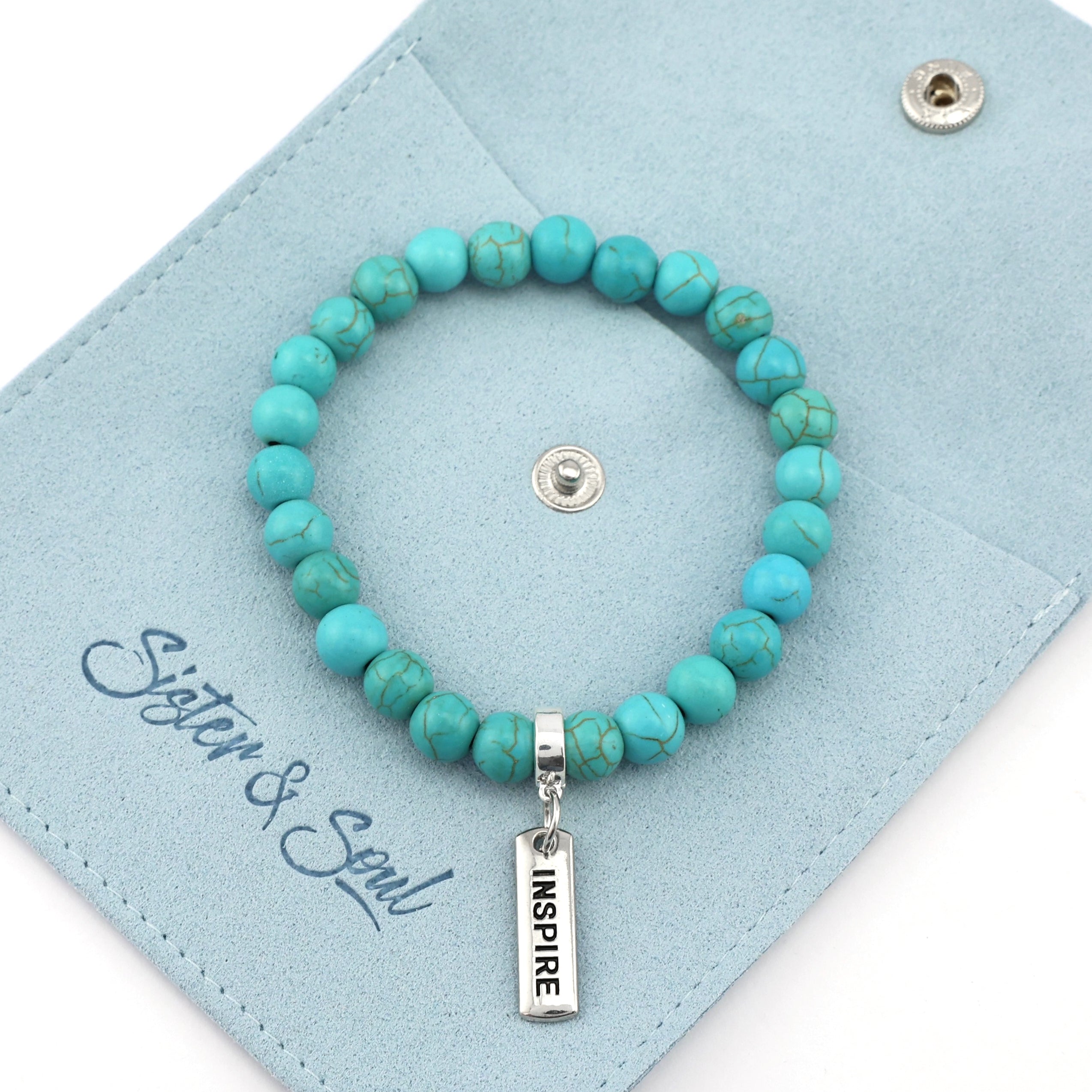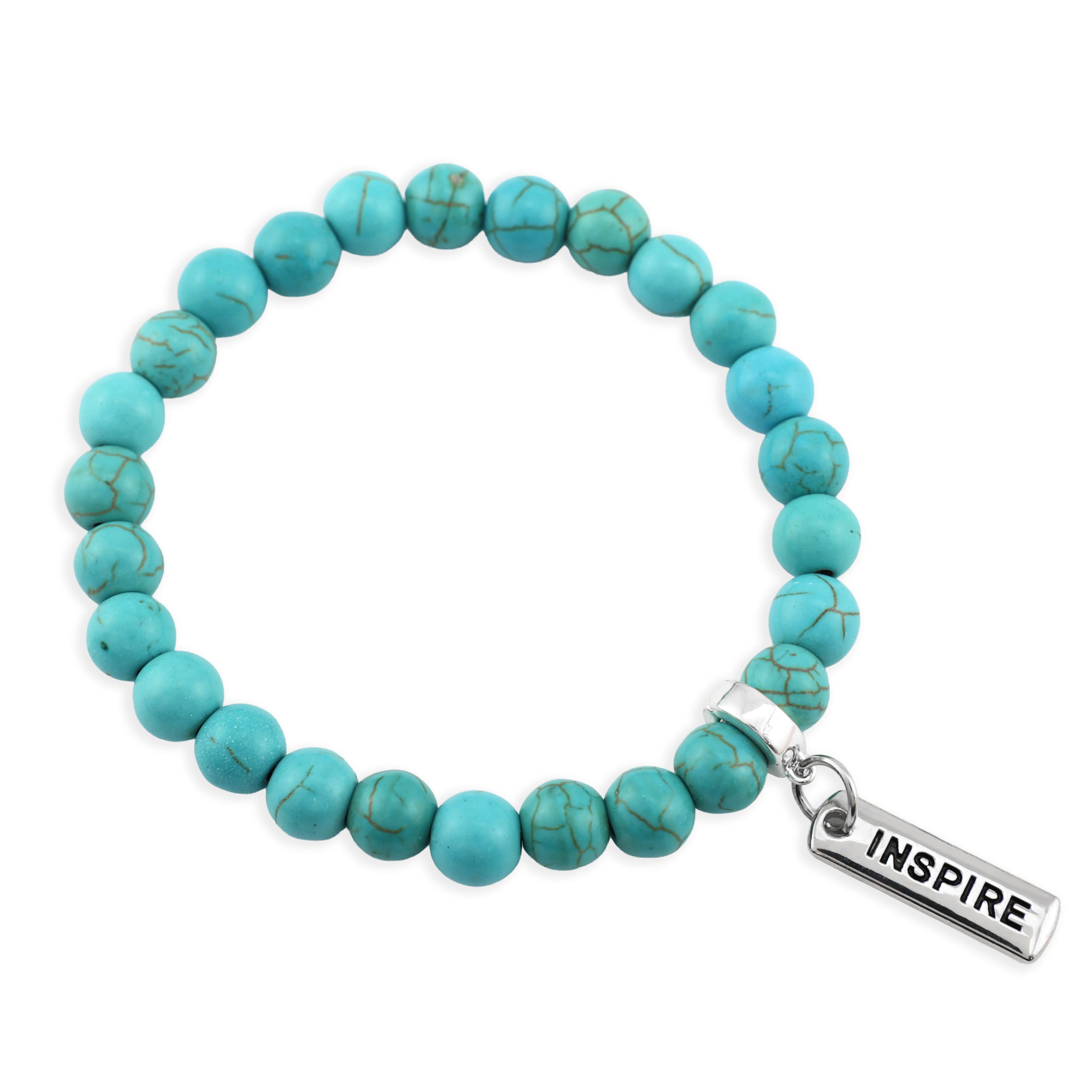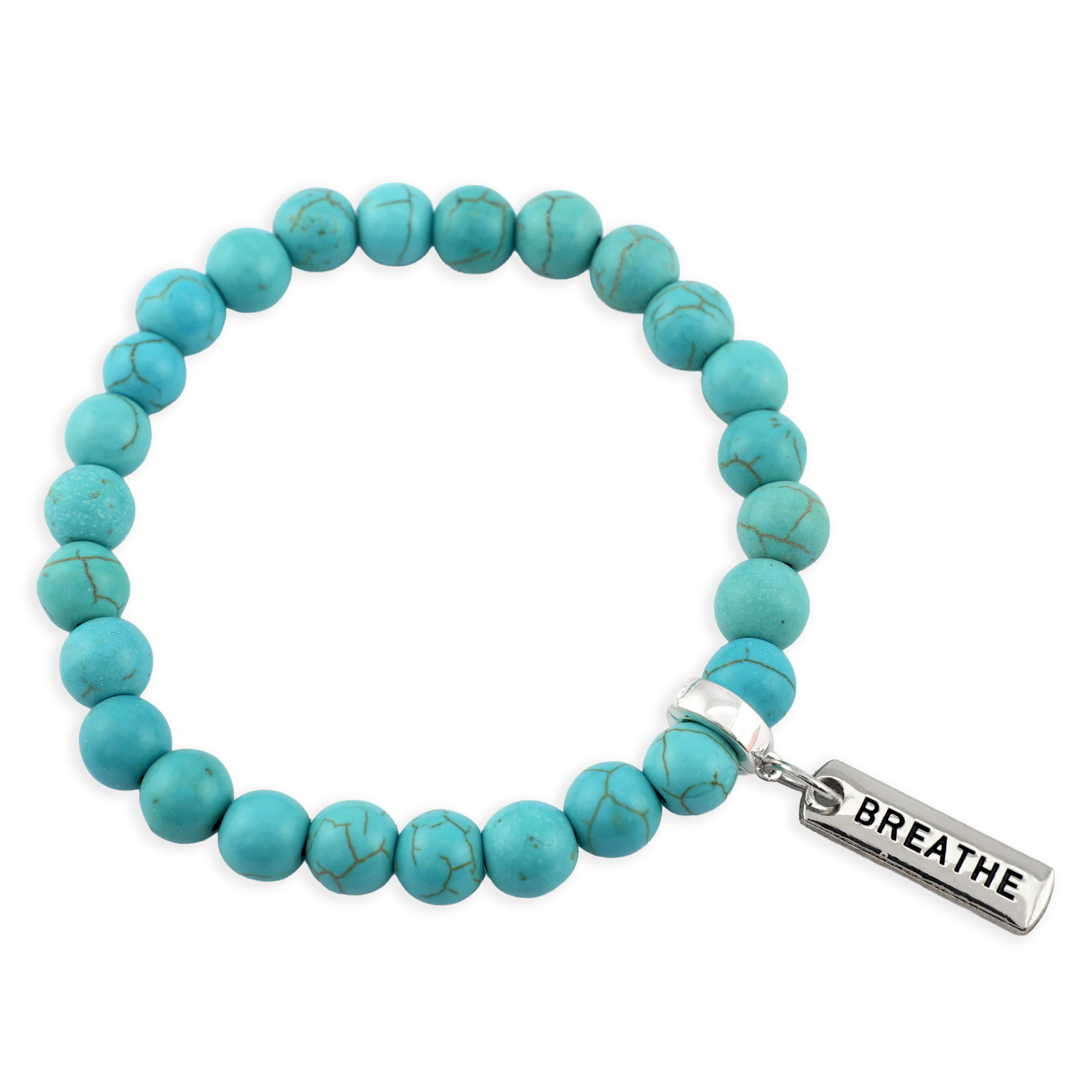 These stunning Turquoise bracelets with word charm have been delicately hand crafted with love, they have a silver plated clip bead and word charms carefully chosen to encourage and lift your spirit. These bracelets make fantastic gifts are a gorgeous addition to your jewellery collection. They look fantastic worn on their own or wear them stacked with other bracelets from our stone range to create your own unique look.