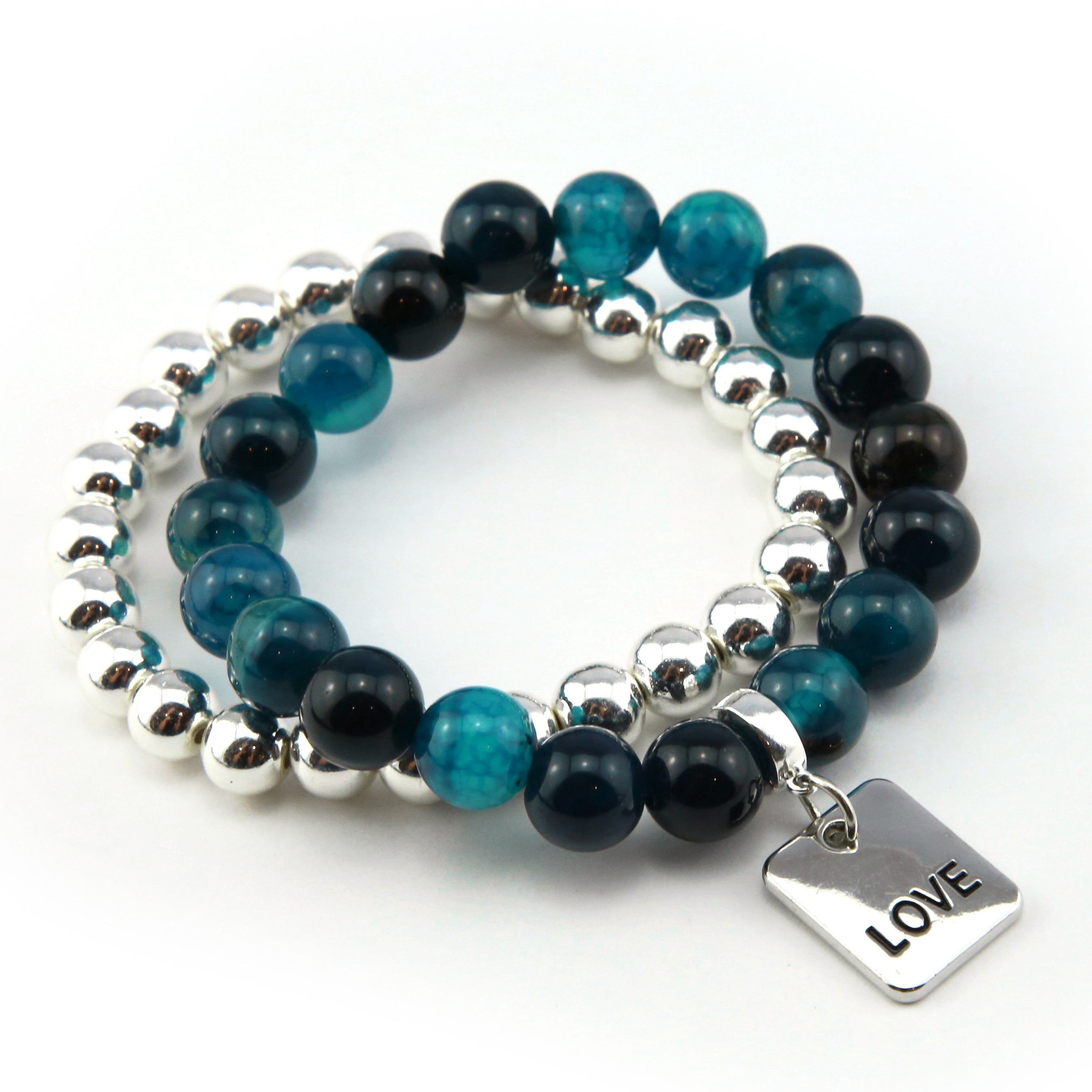 • Bracelet Duo! 10mm Oceans Teal Tourmaline & 8mm Silver bead bracelet stacker set - LOVE (10832)
