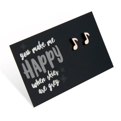 Gorgeous music note studs make the perfect gift. These beauties come presented on a 'You Make Me Happy' Card and are available in silver and rose gold.