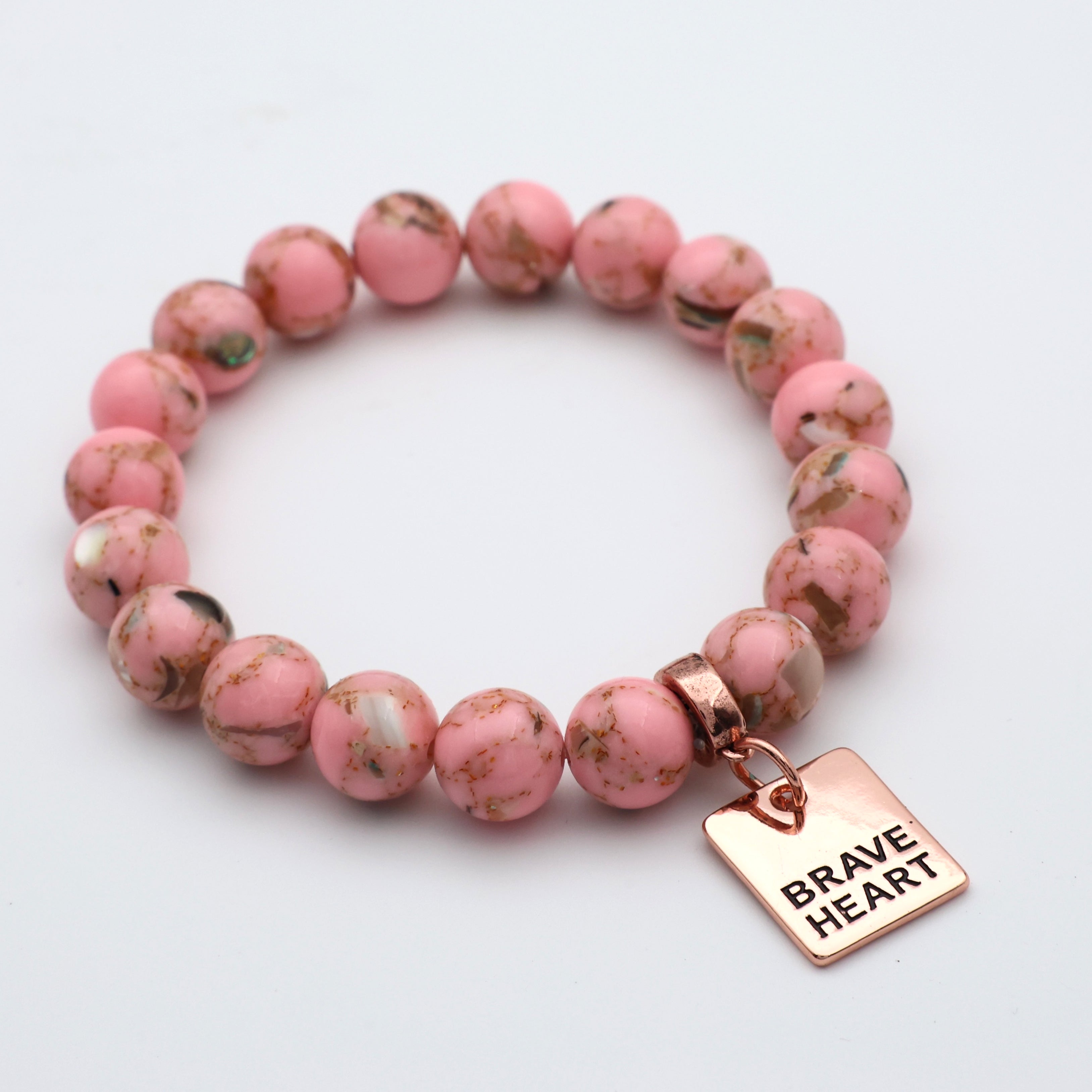 These beautiful pale pink Synthesis Stone stone bracelets, have stunning flecks of shell tones and reflective opal shimmer through the beads. They would make a stunning addition to any jewellery collection. These would also make the perfect gift to encourage a sister through a tough time with words of courage and strength, or to inspire your own soul to keep going, and to press on bravely! We hope this pieces give you wings sister.