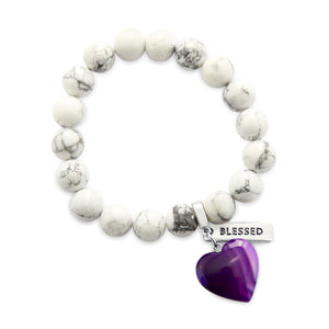 SWEETHEART Bracelet - 10mm WHITE MARBLE with Purple Striped Agate heart charm & Word Charm